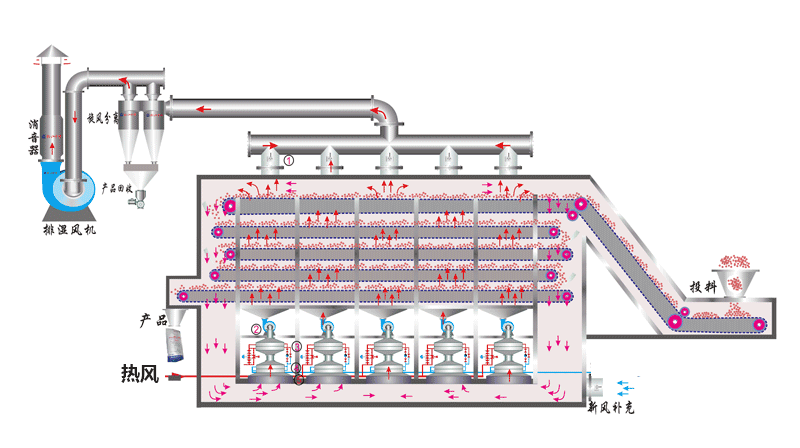 帶式幹燥機主(zhǔ)要由進風單元(yuán)、排風單元、循環風單元、網帶、加熱係統、加料器、傳動機構、控製係統等部件組成。物料(liào)由撒布(bù)機均勻地鋪在網帶上,網(wǎng)帶采用12-60目不鏽鋼(或碳(tàn)鋼(gāng))絲網,由傳動裝置拖(tuō)動在(zài)幹燥機內移動,幹燥段(duàn)由(yóu)若幹單元組成,熱(rè)空氣(qì)通過風機穿過物料層,完成熱量與物(wù)料的交換過程(chéng),含水量較大的氣體由(yóu)排風機排出。